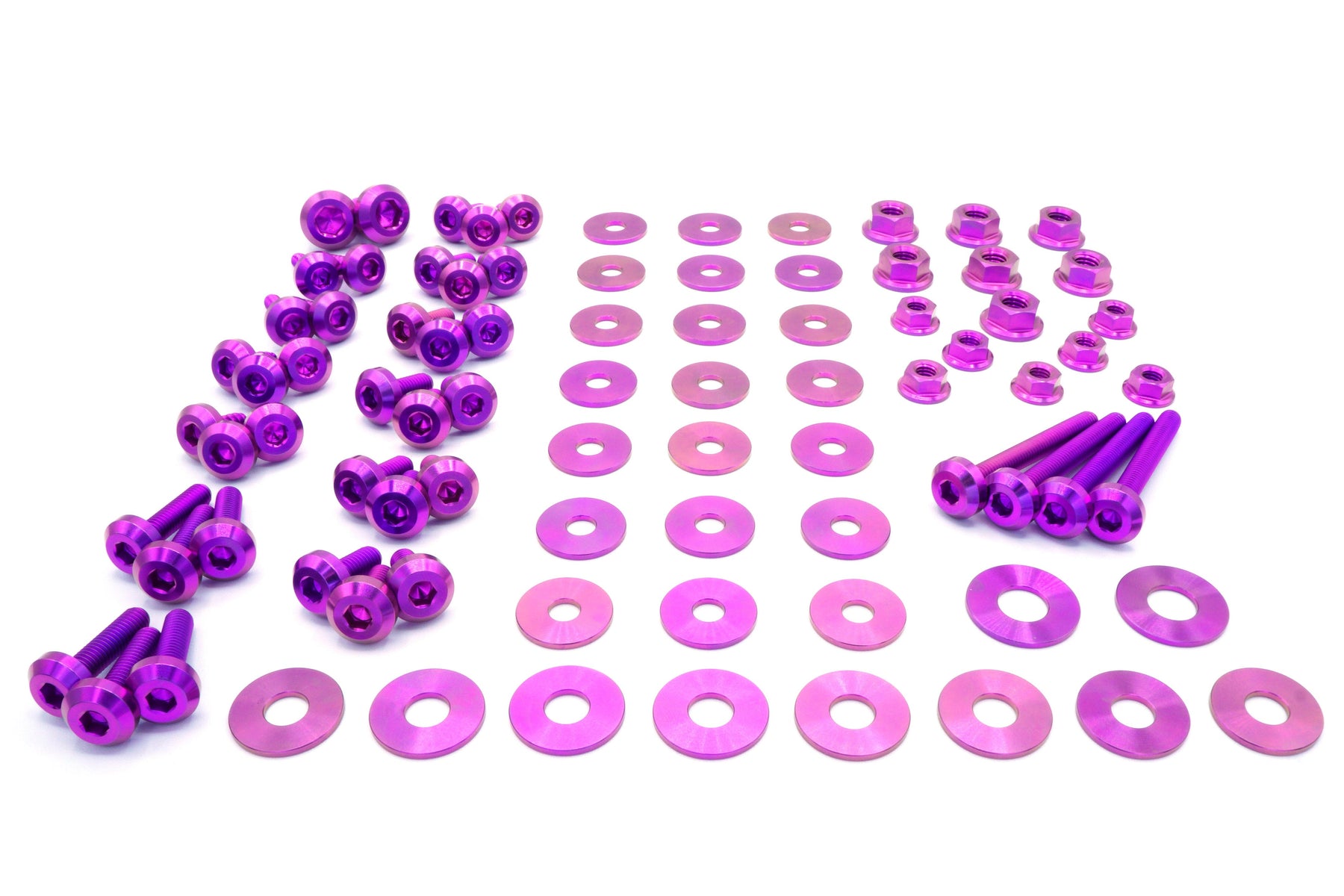 This 85 piece kit includes bolts, screws, nuts, and washers manufactured from extremely durable, anticorrosive, and lightweight GR5 titanium metal.